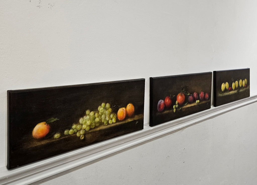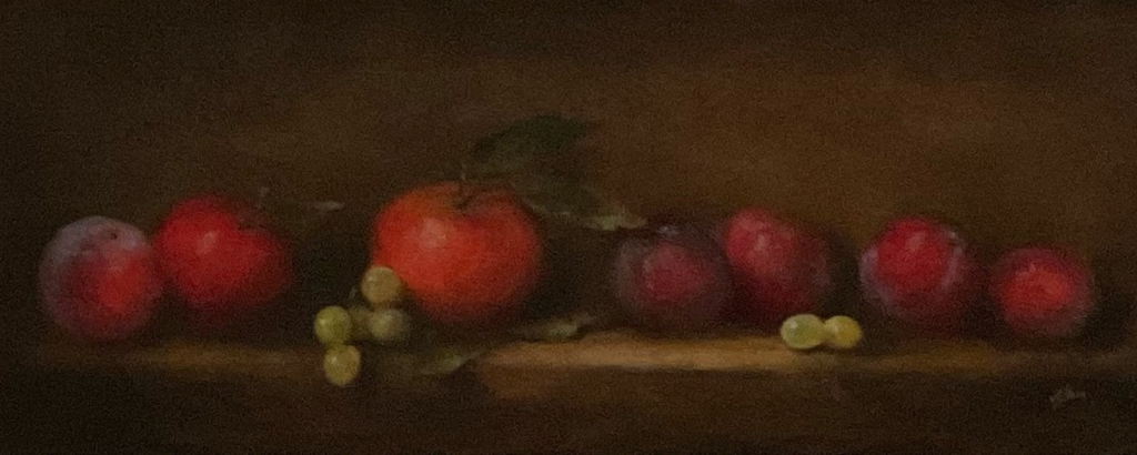 Judith Levin original painting: Apples, Plums and Grapes8 x 20 insoil on canvas